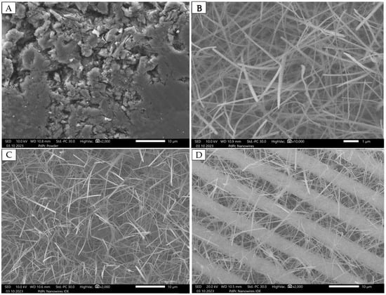 Images (Figure 1) of the scanning electron microscopy (SEM) for the PdPc materials were retrieved from different surfaces for the morphological analysis. Figure 1A shows the SEM image of the PdPc precursor powder. The PdPc nanowire growth was confirmed on aluminum substrates (Figure 1B) and deposition on the interdigitated gold electrode (Figure 1C,D). The thickness of the nanowires varied between around 0.04 μm and 0.36 μm (Figure S4). The lengths of the PdPc NWs were between 7.3 μm and 17.7 μm (Figure S5). The growth of a nanoflower was also observed on an IDE corner (Figure S6). These nanostructures have been reported for other materials and are believed to form by aggregation of the precursor material during the process of deposition [35,36,37,38]. However, it was outside of the electrically connected deposition zone of the device and did not contribute to the current response of the sensor.