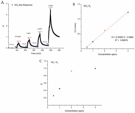 (A) Normalized gas-sensing response toward NO2 at concentrations of 0.5, 1, 2 and 4 ppm. (B) Inverse of the fast response time constant (1/t) as a function of concentration (ppm). (C) Normalized response as a function of concentration.