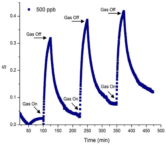 Gas-sensing experiments were conducted with exposure concentrations of 0.5, 1, 2 and 4 ppm of NO2. Clear responses at various NO2 low concentrations were observed. Evidence of a fast adsorption process related to the directly exposed surface areas and apparent saturation on the surface was also evaluated before observing a change in the mechanism. Finally, the reproducibility of the sensing results at 0.50 ppm concentrations of NO2 was successfully achieved, showing similar normalized response (S) percentages after multiple exposures.