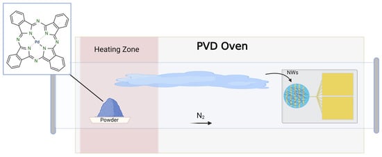 PdPc nanowire formation and preparation of the sensor device was performed using physical vapor deposition (PVD) by following the procedure previously reported by our research group (Scheme 1) [7]. During the deposition process, the purified powder of the palladium phthalocyanine was used as the precursor. The solid was vaporized, followed by deposition of the material on a desired surface [7,28]. To grow the PdPc nanowires on the interdigitated gold electrode, ~15 mg of the purified PdPc powder was weighed on a ceramic holder and put into a quartz tube (1.2 m long/5 cm diameter) reactor placed inside a dual oven (MTI Corporation; CA, USA, Model OTF-1200X-II). Using a mechanical pump (Trivac D 16 B), a pressure of 5 Torr was achieved and kept constant while being monitored with an Inficon PSG55x Vacuum Gauge.