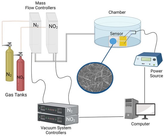 Gas-sensing experiments were performed by placing the PdPc nanowires sensor inside a gas chamber system (MMR Technologies LTMP). The device was electrically connected using two adjustable tungsten tips. A power source (Keithley 6487 Picoammeter/Voltage Source) was used to apply a constant voltage to the sensor while simultaneously measuring the current of the material. The required gas flow for each experiment was controlled by an MKS GE50A Mass Flow Controller and monitored by an MKS 946 Vacuum System Controller (Scheme 2). A constant flow of dry N2 gas was used to create an inert atmosphere inside of the gas-sensing chamber, similar to a previously published procedure by Yan et al. [29]. The specific target gas volume concentration was calculated using the ratios of the diluting gas (N2) mixed with the target gas (100 ppm NO2/N2 gas tank), producing a total gas flow of 500 sccm, and no additional humidity was added. The water presence was determined from the nitrogen tank and was <2 ppm.