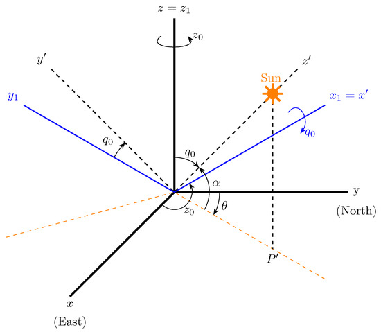 To transform the coordinates and align the direction of the axis with the beam irradiance, we need the solar azimuth and solar altitude (shown in Figure 1). These angles are obtained from the PSA algorithm [30].