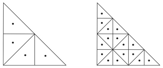 The shading analysis is finalized by examining the shadow projection on a specific set of points known as warning points (WPs). These points are uniformly distributed within the triangle using the Rivara 4-T algorithm [32] and correspond to the geometric centers resulting from each subdivision of the triangle (see Figure 2).