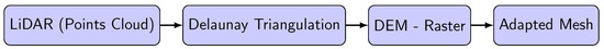 The process is fully automatic and only requires an initial discretization, in this case the DEM, to capture the orography with a fixed accuracy. It has been implemented with the Neptuno library developed by L. Ferragut [44]. The entire mesh generation process, including the DEM construction described in Section 2.3, is summarized in Figure 3.