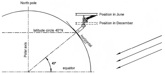 On the other hand, pyranometers dedicated to measuring DHI require a complement that eliminates the direct component of the radiation. The standard procedure for determining diffuse radiation is by using a pyranometer (see Figure 4 and paragraphs below) shadowed by a shadowing ring, made of an opaque material of a calibrated width that avoids direct radiation on the receiver. The ring is positioned so that its axis is parallel to the Earth’s axis in the equatorial coordinate system and passes through the receiver. Figure 4 schematizes the positioning of a shadow ring at a latitude of N, where the arrows on the right side represent the Sun’s rays. Once the ring has been correctly positioned, the receiver will be permanently shaded provided that the ratio of the receiver’s distance from the center of the ring to its radius is close to the tangent of the Sun’s declination. Due to the changing declination of the Sun over the course of the year, the shadow ring requires small adjustments in its position every two or three days, aiming to keep the receiver permanently shaded.