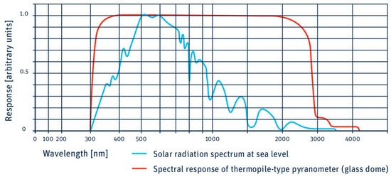 Spectral range response of a pyranometer of the SMP series manufactured by Kipp and Zonen versus the radiation spectrum at sea level (taken from Kipp and Zonen. Instruction Manual SMP Series [50]).