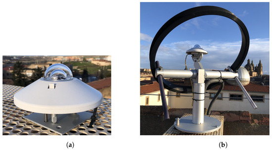 Experimental data were obtained from two pyranometers and a weather station, shown in Figure 7, installed on the rooftop of the Trilingüe building at the Faculty of Sciences (40.96062° N, 5.67075° W) of the University of Salamanca (Spain): a pyranometer Kipp and Zonen SMP10 (Figure 7a) and a pyranometer SMP10 with shadow ring model Kipp and Zonen CM 121 (Figure 7b).