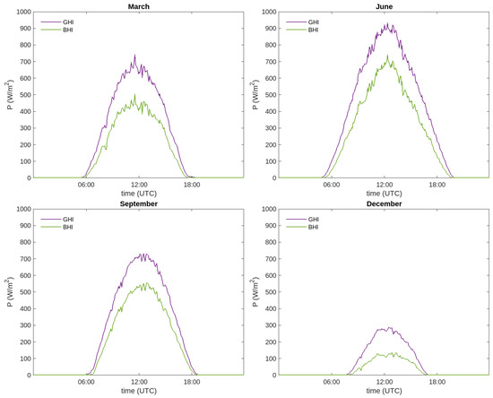 The irradiance curves introduced below are intended to be as close as possible to the actual measurements, so no statistical treatment beyond averaging is carried out. Figure 8 shows the irradiance curves for four representative months of the year: March, June, September and December. In all these plots, a certain level of noise is observed within the irradiances, which evinces that the pyranometers are very sensitive to small changes. For example, on a summer day with isolated clouds, if a cloud comes between the Sun and the pyranometer for a few minutes, the direct components will become very small. When the cloud has passed, the direct component will again reach high values. When observing the set of figures, it can be noticed that the irradiance curves increase in width and height in the summer months. On the contrary, during winter, when the Sun is up for less time and at a lower height above the horizon, the curves become narrower and present lower peak values.