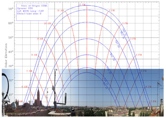 - University of Oregon. Sun Path Chart Program. 2023. Available online: http://solardata.uoregon.edu/SunChartProgram.php (accessed on 31 January 2024).