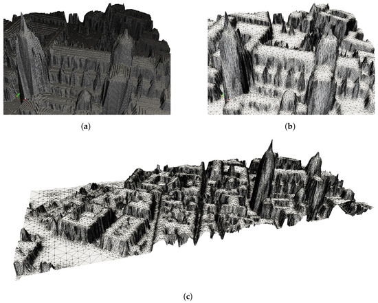 In the context of GIS and the representation of architectural features in the urban environment, a common approach is the use of the so-called 2.5D polygons, which consist mainly of a simplified representation of buildings as a composition of extruded shapes. The previous studies suggest that the polygon-based 2.5D urban mapping strategies might not be able to hold the needed detail when buildings that feature more complex shapes come into play. However, some works have extended the 2.5D geometry concept through the adaptation of more complex architectural shapes by using LiDAR data to reproduce the building geometry by means of a composition of arbitrarily and vertically (walls) oriented polygons within an adaptive mesh [20]. The present work uses a similar approach; we generate a high-definition DEM that accurately captures the terrain and the architectural geometry. This DEM is created from LiDAR data with a scan spacing of 0.30 m. Computing the shadows with this high-definition DEM is too computationally expensive, so instead, we use a triangular mesh adapted to it.