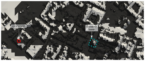 The accuracy of the MAPSol model has been validated by comparing the calculated data with data measured by two pyranometers. The calculated accuracy is close to on days with low cloud cover. It is worth noting that on some of these days, the sensors detect the shadow of the dome of the cathedral tower in the early hours of the day.