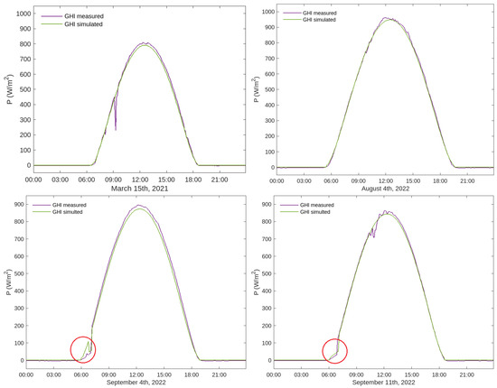 Here, and represent, respectively, the measured and calculated value of the global irradiance at time , corresponding to the time instants for which data are available. refers to the maximum measured , and is the mean of the measured GHI. Table 5 summarizes the statistical indicators described above for the four selected days, showing very small values, especially the normalized errors, resulting in a higher coefficient of determination ().