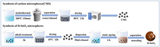 As shown in Figure 1, a simple one-step hydrothermal method was used to synthesize uniformly shaped and sized carbon microspheres [29]. Firstly, carbon microsphere (CMS) templates with uniform size were obtained by dissolving sucrose in deionized water and utilizing the polymerization reaction of a sucrose emulsion under hydrothermal conditions. Then, D-SnO2 microspheres were prepared using CMS as sacrificial templates. The CMSs were dispersed ultrasonically in 100 mL of a 0.05 M NaOH solution and alkaline treated for 3 h at room temperature. Subsequently, the alkali-treated CMS templates and SnCl4·5H2O were sequentially added into 30 mL of anhydrous ethanol, ultrasonically dispersed for 30 min, and aged at room temperature for 4 h. Finally, D-SnO2 microspheres were obtained by alternately washing with deionized aqueous water and anhydrous ethanol, drying, and calcinating at 500 °C for 2 h, with a heating rate of 1 °C/min.
