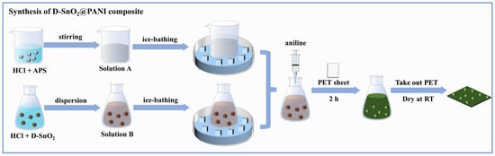 The DSPx binary composite was prepared by an in situ polymerization method [19]. As shown in Figure 2, firstly, 0.2 mmol of APS was added to 1 M HCl and stirred in an ice bath for 30 min to form Solution A. Then, a certain quantity of D-SnO2 powder was added to another portion of HCl and stirred in an ice bath to produce Solution B. Solution A was transferred to Solution B under ice-bath conditions, and then the fixed-size PET sheet (0.8 cm × 1.0 cm) was sequentially added to the solution and purified in aniline liquid by distillation, reacting for 2 h away from light. Finally, the PET sheets containing the DSPx-sensitive material were removed and left to be dried naturally at room temperature within 24 h so as to obtain gas-sensitive elements that can be used for gas-sensing tests. In this experiment, we modulated the molar ratios of the added D-SnO2 and aniline (: × 100% = 0%, 10%, 20%, 30%, and 60%, respectively) to prepare a series of DSPx-sensitive elements and explored the effect of different compounding amounts on gas-sensing performance.