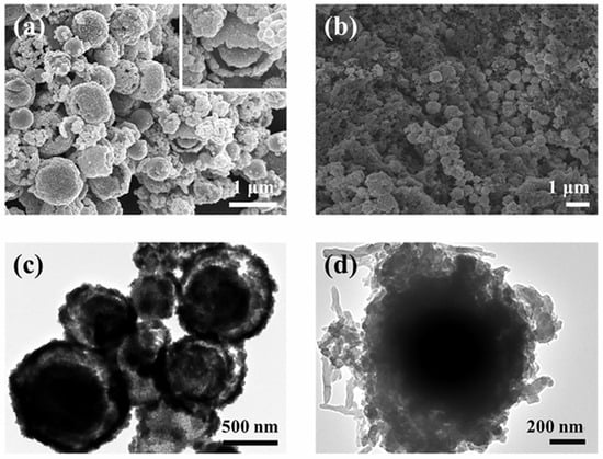 SEM images of (a) D-SnO2; (b) DSP20; TEM images of (c) D-SnO2; (d) DSP20.