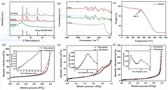 (a) X−ray diffractograms of D−SnO2, PANI, and in situ−polymerized DSP20 samples; (b) FTIR spectra of D−SnO2, PANI, and DSP20 samples; (c) the thermo−gravimetric analysis curves of DSP20 composites; nitrogen adsorption−desorption isotherms and pore-size distributions of (d) PANI, (e) D−SnO2, and (f) DSP20.