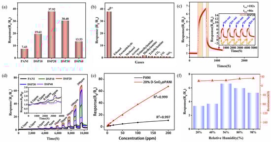 (a) Effect of different molar addition percentages of D-SnO2 and PANI on the sensing performance of sensors at room temperature and an ammonia concentration of 100 ppm; (b) the selectivity of DSP20-based sensors towards different gases with 100 ppm concentration at room temperature; (c) transient curves of the response and recovery of the DSP20-based sensor to 10 ppm concentration of ammonia at room temperature, and transient curves of the recovery of the response of the DSP20 sensor to 10 ppm NH3 five consecutive times at room temperature in the inset; (d) recovery curves of the dynamic response of the PANI- and DSP-based sensors to 0.1–200 ppm NH3 at room temperature, and the inset shows a localized zoomed-in plot of the dynamic response of all the sensors at concentrations of 0.1–1 ppm NH3; (e) nonlinear fitting curves of the response of the PANI- and DSP20-based sensors to 0.1–200 ppm NH3 at room temperature; (f) the response and fundamental resistance plots of the DSP20-based sensor under 10 ppm NH3 at different relative humidities.