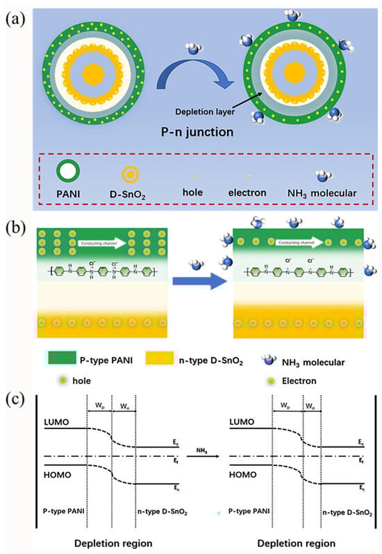 The dramatic improvement in the sensing performance of the DSP20 compound can be mainly attributed to the following two aspects: firstly, the composite exhibits a dual-shell microstructure, featuring a substantial specific surface area and permeable pores, facilitating enhanced gas diffusion and adsorption [37]. Additionally, when the n-type D-SnO2 surface undergoes in situ polymerization with p-type proton-doped polyaniline (PANI-H+), the holes in PANI-H+ and the electrons in D-SnO2 mutually diffuse. This results in the formation of a p-n heterojunction at the interface, as illustrated in Figure 7. When the sensor is exposed to air, driven by the energy level difference between PANI-H+ and D-SnO2, the holes in PANI-H+ and the electrons in D-SnO2 diffuse in opposite directions, forming a narrow depletion layer. This leads to a re-balancing of the Fermi level, resulting in a lower-resistance state for the sensing material. Upon exposure to NH3, NH3 captures the H+ in PANI-H+, leading to a further increase in the width of the depletion layer, causing a sharp rise in material resistance. Hence, the signal amplification of the p-n heterojunction in this reaction significantly enhances the sensing performance of DSP20.