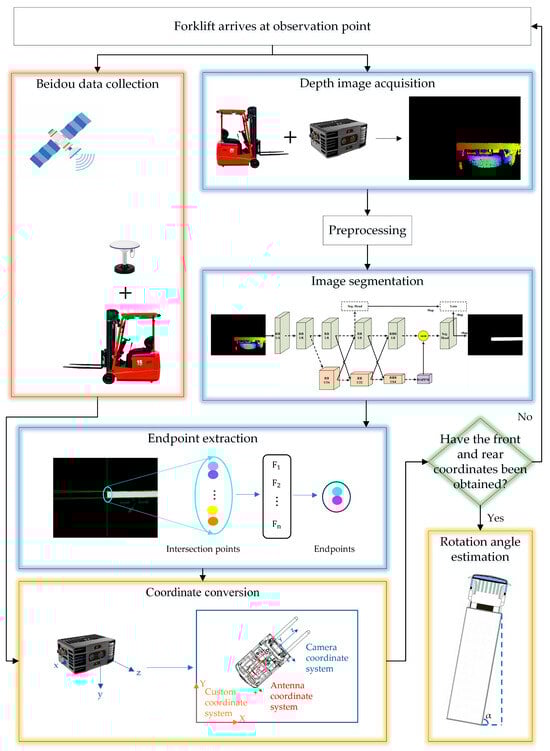 Our method can be divided into five modules: depth image acquisition and preprocessing, image segmentation, endpoint extraction, BDS data acquisition, and coordinate conversion with rotation angle estimation. Firstly, the double-antenna mobile receiver was installed on the unmanned forklift to acquire the position and yaw angle of the forklift. Additionally, an RGB-D camera was installed to capture depth images near the front and rear endpoints of the flatbed. The truck flatbed was segmented from the depth image using the Deep Dual-Resolution Network-23-slim (DDRNet-23-slim) []. Straight lines were extracted from the edges of the flatbed using the Hough transform [], and the intersection sets of these lines were computed. A neighborhood feature vector was subsequently designed to locate the endpoint of a flatbed from a set of intersection points through feature screening. Finally, the relative coordinates of endpoints were converted to the absolute coordinate system using the BDS positioning. This process determined the precise position of the flatbed truck, and the rotation angle estimation was performed based on the front and rear endpoints. The flowchart is shown in Figure 1.