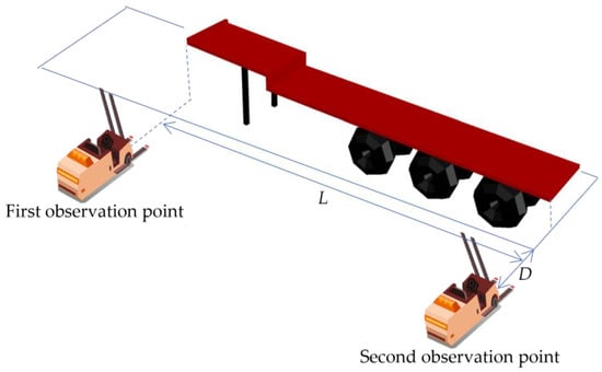 The location of the observation point is related to the length of the flatbed, the parking space line, the camera’s view and ranging accuracy, the length of the fork, and the forklift motion control error. Flatbed trucks were backing into parking spaces, and their rearward movement was limited by the placement of wheel chocks. The second observation point was located along the extension of the rear parking space line. The distance from the first observation point to the second observation point along the side parking space line is equal to the length of the flatbed. The vertical distance between the observation points and the near sideline of the parking primarily depends on the camera’s viewing angle and ranging accuracy. It must meet the following conditions: (1) One endpoint of the flatbed must be within the camera’s view, even if the vehicle is parked at an angle, and there are errors in the forklift motion control. (2) Observation points should not be located too close to flatbed trucks to prevent safety accidents. (3) To maximize ranging accuracy, the observation point should not be too far away from the truck’s position line because ranging accuracy decreases with distance. The location of the observation point is determined artificially by combining the above conditions. The details of the observation point, loading truck’s space number, type, flatbed length, and loading task are provided to the forklift. Among them, the second observation point is associated with the parking space number, while the first observation point is determined by the second observation point and the length of the flatbed. The distribution of observation points is shown in Figure 2, where denotes the length of the flatbed and denotes the vertical distance between the observation points and the near sideline of the parking.