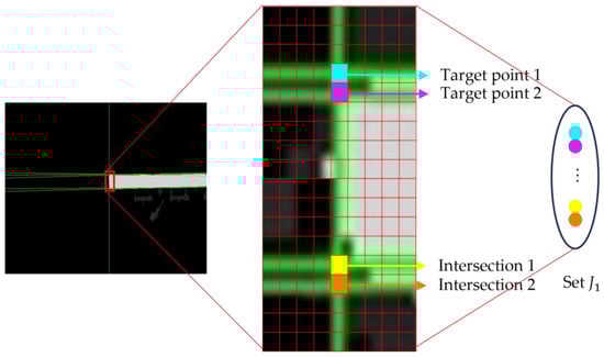The depth image is unstable at the boundary, resulting in endpoints that do not align precisely with the theoretical pixel features. Therefore, the statistical range of neighborhood features has been expanded. A square window with a side length of pixels was constructed centered on the intersection point, as shown in Figure 7. The pixel values in the upper-left, upper-right, lower-right, and lower-left sectors of this intersection point were recorded as its features. Taking case 1 in Table 2 as an example, this intersection pixel is characterized by the vector , where , , , , and each vector contains elements.