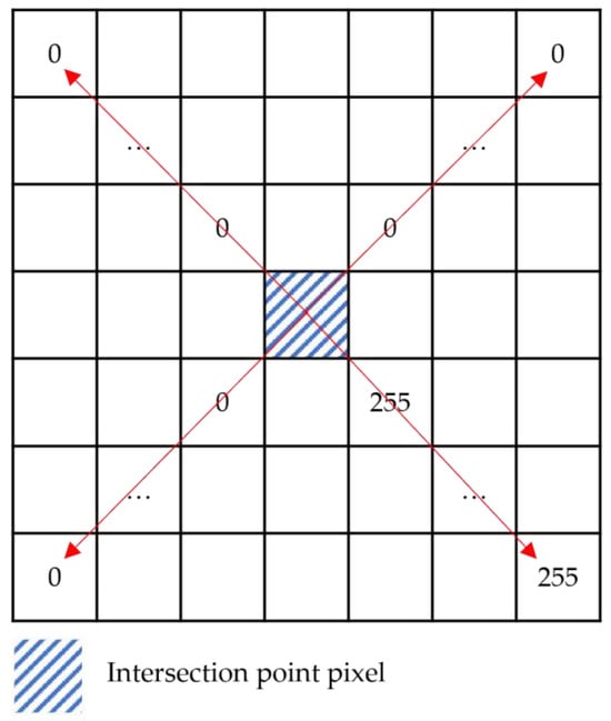 For any intersection point, if the number of elements in the , , and vectors with a value of 255 was less than 1/5 of and the number of elements in the vector with a value of 255 was more than 4/5 of , the intersection point was considered an endpoint. The set consisting of multiple endpoints was denoted as . As shown in Formula (1), where , , , and denote the ith element in the feature vectors , , , and , respectively, and denotes the number of elements in the vector.