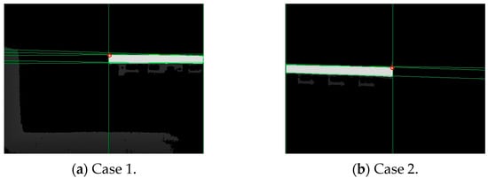 Edge detection is a common method for segmenting images based on gray-level variations, which essentially involves extracting the features of the discontinuous parts of the image []. Canny edge extraction [] was performed on the depth binary image, followed by the extraction of straight lines using the Hough transform []. The lines that were identified as approximately horizontal and vertical, i.e., lines with angles close to 0 and 90 degrees to the upward direction, were labeled as set and set , respectively. The intersection of the lines in set with the lines in set was then calculated. The set of intersection pixels was denoted as .
