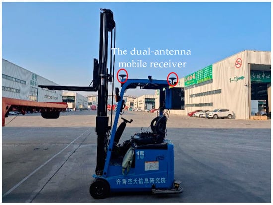A BDS reference station was established near the logistics center, and a dual-antenna mobile receiver was mounted on top of the forklift, as illustrated in Figure 9. The data from the BDS reference station and the mobile receiver were differentially processed to eliminate errors such as atmospheric delays and receiver clock differences. This process aimed to obtain the precise position and yaw angle of the forklift.