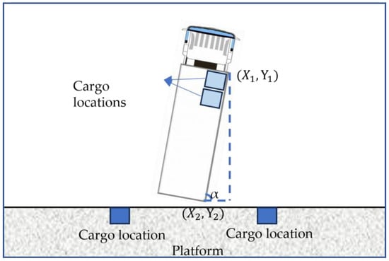 In the custom coordinate system, the front endpoint of the flatbed truck was labeled as , and the rear endpoint was labeled as . The linear Equation (4), which can be used to determine the cargo position, is constructed as follows.