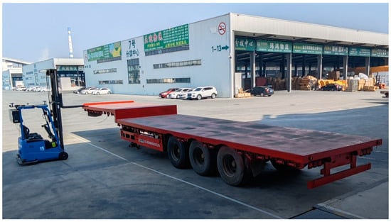 These experiments were conducted at Shunhe International Intelligent Logistics Park in Linyi City, Shandong Province. The field situation is illustrated in Figure 12. It should be noted that the method is intended for outdoor loading scenarios. During the loading process, it is essential to ensure that there are no obstructions above the forklift’s path to guarantee that the BDS receiver can acquire the satellite signal. In this case, the BDS receiver can achieve an accuracy of 1.2 cm.