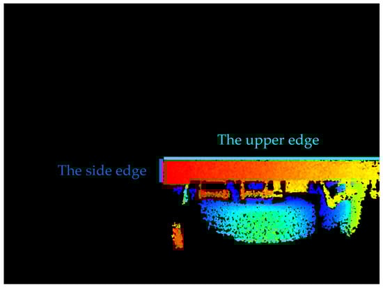 The upper edge contour of the flatbed truck is long and approximately transverse, while the side edge is short and approximately vertical, as illustrated in Figure 14. A set of straight lines , whose angles with the upward direction (clockwise as positive and counterclockwise as negative) fell within the threshold range of [, ], was selected from set to align with the upper edge of the flatbed. Here, was set at 88°, and was set at 92°. When the flatbed truck is parked at an angle, the upper edge of the flatbed truck in the depth image will rotate accordingly. Therefore, the threshold range above can be appropriately increased. Similarly, a set of straight lines , whose angles with the upward direction fell within the threshold value of [, ], was selected to align with the side edges of the flatbed from the set , where was set to be −0.5° and was set to be 0.5°.