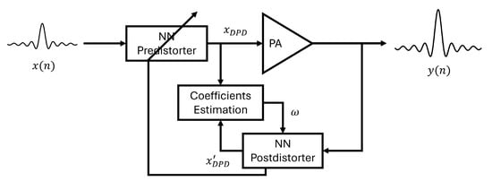 Learning the characteristics of the PA is key to generating the predistorter. Two commonly used architectures for identifying the coefficients of DPD are the direct learning architecture (DLA) and indirect learning architecture (ILA) [,,]. The DLA first trains a PA model based on the PA’s input and output, then inverts this model to implement a predistorter. In the ILA, a postdistorter is trained as an inverse nonlinear PA model, and then, the coefficients are copied to the predistorter to achieve DPD. Because of its good performance and straightforward implementation, we adopted the ILA structure combined with different neural network models to estimate the parameters of DPD, as shown in Figure 1.