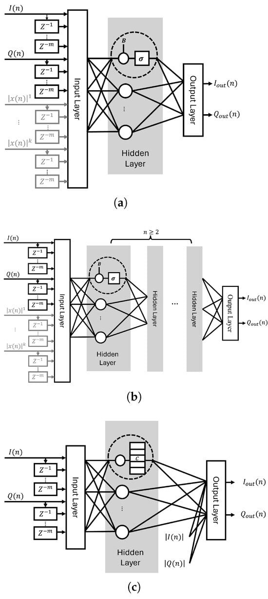 Neural networks (NNs) have an inherent parallel structure and are naturally suited to multiple PAs [,]. Many researchers are investigating NNs for DPD as NNs are more adaptable than the memory polynomial approach, due to the ability to take advantage of additional inputs such as the input signal magnitude or temperature. This is increasingly important for 5G and 6G scenarios. In this paper, we investigated efficient implementations of such DPD solutions that could be incorporated into hardware blocks in the future.