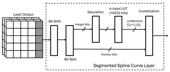 The only hidden layer of the SSCNN is the segmented spline curve (SSC) layer. Based on the mathematical analysis in the previous section, the segmented spline curve layer design can be divided into several small blocks. The block diagram of the SSC layer architecture is shown in Figure 4. The output of the previous layer is presented as the input matrix. The bit-shift block is used to multiply the input matrix by defined in Equation (1). During the training phase, we chose the coefficient array length L to be a power of 2 plus 1 so that the value will become a power of 2, and the multiplication can, therefore, be achieved by bit shifting. After shifting, a bit-split block is used for parallel processing of Step 3 and Step 5 from Section 4.1. The bits of the integer part from the shifting block are used as the address for the LUT-based distributed memory which contains the 32-bit-wide coefficients. As the LUT-based distributed memory size is limited by the segment length L, which was decided during the training phase, the integral part of should not exceed the memory address. Thus, those integers are truncated in the saturation block to prevent memory access overflow. For example, in our case, we chose the coefficient array length L to be 9, which means the integer bits after the saturation block are 4 bits to access the memory address between 0 and . After saturation, the trainable coefficients in the memory are read while the bits of the fraction are sent to the combination block for calculation. Finally, the combination block combines all the parts needed to achieve the spline activation function. The output of the segmented spline cure layer will be passed to the output layer of the SSCNN shown in Figure 2.