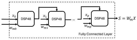 Systolic processing for fully connected layer. is the input vector of the layer; is the weight vector; the output of each DSP48 slice is one of the addends for the next slice.