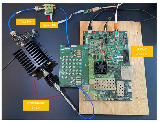 Experimental setup AMD/Xilinx RFSoC ZCU111 board, XM500 RFMC balun board, NXP AFSC5G37D37 Doherty PA (test PA), PA NXP BGA7210 (driver PA), (a 40 dB attenuator chain).