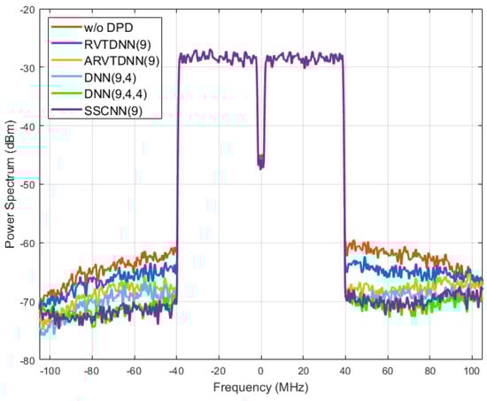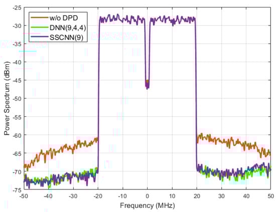 Figure 8 shows the two DPD’s out-of-band linearization performance. The power spectrum refers to the distribution of power into frequency components composing that signal. Ideally, the power should be focused on the transmitted signal’s baseband. The PA’s nonlinear performance will lead to an increase in power beyond the baseband range and leak power to a neighboring channel to cause interference. As the orange line indicates here, outside of the bandwidth of the transmitted signal, the power was above −70 dBm. This line indicates the signal transmitted after the PA, without DPD. The green and purple lines, showing the performances of the three-hidden-layer DNN and SSCNN, represent that the transmitted signal’s shoulders are notably reduced compared to the transmitted signal without predistortion. This reduction signifies a decrease in the risk of the PA-transmitted signal interfering with adjacent channels when employing NN-based DPD. Once again, the SSCNN and the DNN with three hidden layers produced a similar degree of out-of-band linearization. Figure 9 presents all five models’ spectrum performance.