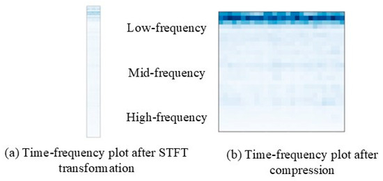 where is the time domain signal, and represents the window function. During the transformation, the length of the window affects the time and frequency resolution. As the window length increases, resulting in a longer intercepted signal, a trade-off emerges between the time resolution and the frequency resolution. Specifically, longer windows lead to a lower time resolution but a higher frequency resolution. In this paper, the Hanning window is chosen as the STFT window function, with a window width of 2048 points, and the overlap between the two windows is 50%. This choice ensures that each frame encompasses at least one complete rotation signal of the motor. To compress the original time–frequency map, an adaptive pooling module is employed, generating a time–frequency map with dimensions of 28 in length and width. Figure 4 illustrates the time–frequency graph samples before and after processing.