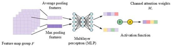 The two feature maps are subsequently input into a multilayer perceptron, each comprising a hidden neuron layer. This process results in the generation of two channel attention maps. In order to obtain a better nonlinear learning ability and reduce the number of parameters and computation, the number of neurons in the hidden layer is defined as , in which is the compression ratio. The corresponding elements of the two channel attention maps that are obtained by the multilayer perceptron are combined, and subsequently, the sigmoid activation function is applied to obtain the channel attention weights. The calculation process of the channel attention is shown in Figure 6. The attention weight generation process is shown in the following formula: