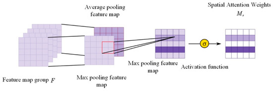 In the channel direction of the feature map group, the information is aggregated through two pooling methods, and the maximum and average pooled feature maps and are obtained; the dimension can be defined as . The two feature maps are spliced, and then, the convolution kernel with the convolution area is used to perform the convolution operation on the feature map. Finally, the sigmoid activation function is used to obtain the spatial attention weights. The calculation process of the spatial attention is shown in Figure 7. The attention weights are calculated as follows: