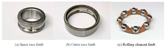 In the experiment, three typical bearing faults located in the inner race, outer ring, and rolling element, respectively, which are shown in Figure 10, were simulated. Each type of fault includes four degrees of fault, controlled by the diameter of the sintering area of the laser at the fault point during processing, which are 0.8 mm, 1.0 mm, 1.2 mm, and 1.4 mm, respectively. The experiments in every fault type are executed with four different rotation frequencies, which are 10 Hz, 20 Hz, 30 Hz, and 35 Hz, and six different load levels. In this way, a total of 288 simulated operating states are generated. Five repetitions of each experiment are conducted under each fault state with the applied rotation frequency and load level. That is to say, the total number of samples in the dataset is 1440.