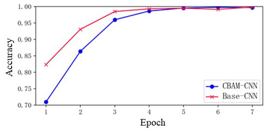 The accuracy of the Base-CNN curve increases slightly faster than that of the CBAM-CNN curve, because the Base-CNN training process does not contain the calculation process of the CBAM module. However, it is worth noting that the CBAM-CNN achieved a rate of 0.9867 after four rounds of training, which is close to the accuracy of the Base-CNN, and reached a rate of 0.9981 after the sixth round of training, surpassing the Base-CNN’s accuracy rate.