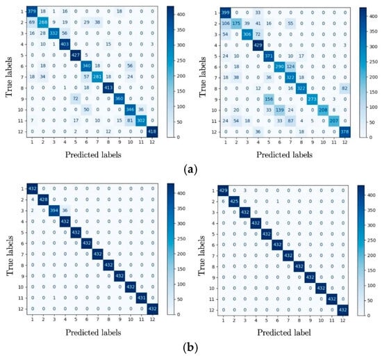 Confusion matrix formed in the first round and the sixth round. (a) depicts the confusion matrix for the first round, whereas (b) is for the sixth round. Each image presents the confusion matrix results for the Base-CNN on the left side and the CBAM-CNN on the right side. The true labels are from the validation set, while the predicted labels are the outputs of the CBAM-CNN and Base-CNN. Twelve labels are the combination of 3 types of bearing faults, which are inner race faults, outer race faults, and rolling element faults, and 4 rotation frequencies, which are 10 Hz, 20 Hz, 30 Hz, and 35 Hz. The values corresponding to the same true and predicted label indicate the number of correct predictions for that particular fault state category.