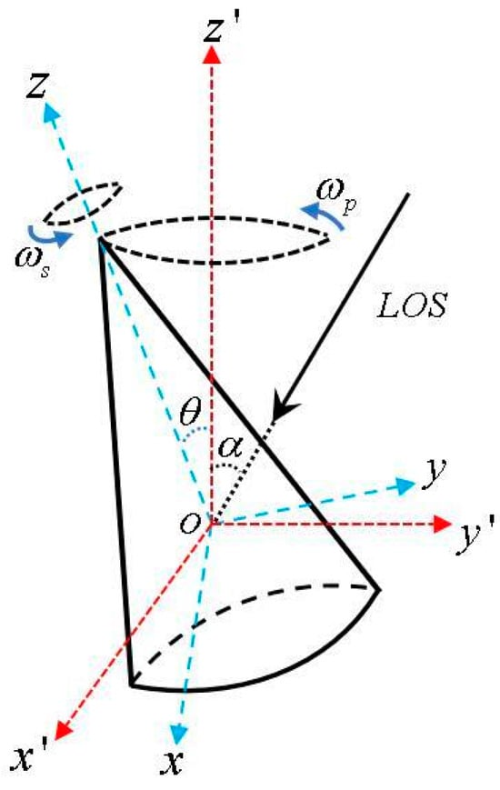 The schematic diagram of cone precession is shown in Figure 1. Point o is the center of mass, is the reference coordinate system, and is the ontology coordinate system. α is the lidar line of sight angle. To simplify the operation, let α be in the o y z plane. The LOS angle unit vector is denoted as follows: