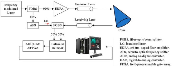 FMCW laser ranging is an absolute measurement technique based on self-heterodyne interferometry [28]. The basic ranging system is shown in Figure 2. The laser source is a frequency-modulated continuous beam, and the output laser is divided into two beams in a ratio of 1:9 by a beam splitter, in which 10% of the beam energy is used as the reference light and passes through an acousto-optic modulator, while 90% of the beam energy is used as the emission beam and passes through an amplifier. The emitted beam is incident from the emitting lens onto the surface of the measured object. The scattered echoes interfere with the reference beam in the beam combiner through the receiving lens, and the mixed beam is input 1:1 into the balanced detector to obtain the beat frequency signal. Finally, the signal is input into the computer through a signal acquisition card to display the time-domain and frequency-domain information about the beat frequency.