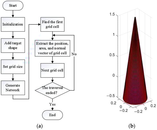 The flowchart for establishing the network model is shown in Figure 3a. Firstly, the 3D mesh generation function is initialized and used to generate the 3D mesh of the cone. Then, read the target shape parameters are read and the generation function is used to transform a solid object into a three-dimensional surface. Finally, by reading the laser wavelength, the size of the object segmentation into small units is determined to obtain the surface network. The established three-dimensional network model of the cone is shown in Figure 3b, with a cone height of 2 m, a center of gravity height of 0.5 m, and a bottom radius of 0.25 m.