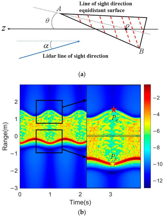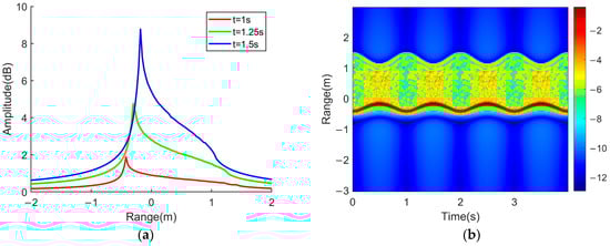 The cone precession parameters and FMCW lidar emission parameters are shown in Table 1. Using Equation (14), the one-dimensional distance profiles of the precession cone at different times are simulated, and the distance–time map obtained by arranging the one-dimensional distance profiles at different times within the total time is shown in Figure 4.
