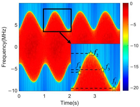 By reading the frequency values corresponding to four different time points within one precession cycle on the edge curve in the time–frequency spectrum, as shown in Figure 5, and then substituting the four frequency values as frequency shift maxima into Equations (20)–(23), four nonlinear equations with unknown cone parameters can be established.