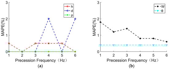 MAPE for extracting parameter values varies with precession frequency. (a) MAPE for extracting values of h, d, ρ; (b) MAPE for extracting values of W, θ.