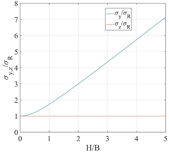 where and are the uncertainties along y and z, respectively, and are the uncertainties affecting . From Equation (7), it is evident that depends on the ratio between H and B. The uncertainty was normalized with respect to , and the resulting ratio was plotted as a function of , as shown in Figure 4. For completness, was considered as well. For the geometry adopted in this work, for each value of . It is worth noting that, in general, the condition could correspond to two different situations, namely and ; in this work, the latter situation was considered.